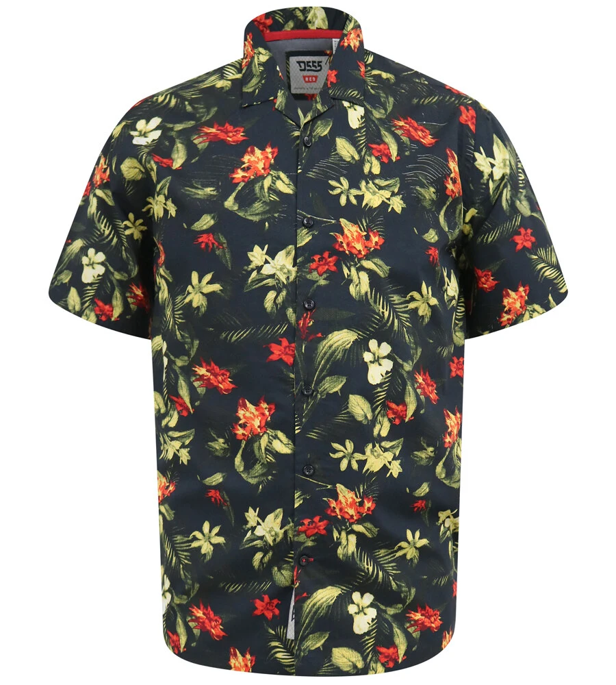 Skjorte fra D555 i et flot tropisk design med mørk bund og farverige blomster i grønne, røde og lyse nuancer. Det livlige print giver et sommerligt og stilfuldt udtryk, som er perfekt til både ferie og afslappede dage.