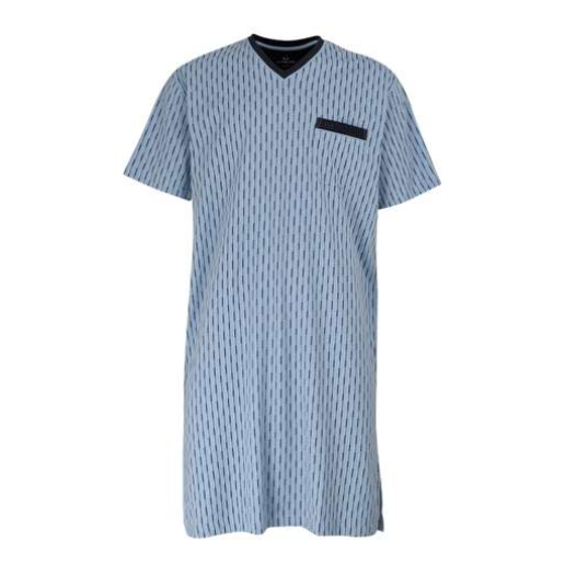 Lang nattrøje/natskjorte med korte ærmer til mænd fra Götzburg. Denne nattrøje er blå med all-over printet mønster. Den har slidser i siderne og V-hals med navyblå kant.