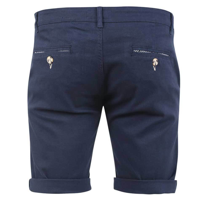 Navyblå chino shorts med stretch fra D555. Shortsene har to stiklommer samt en lille lomme foran. Bagpå er der to lommer, der bliver lukket med en knap.