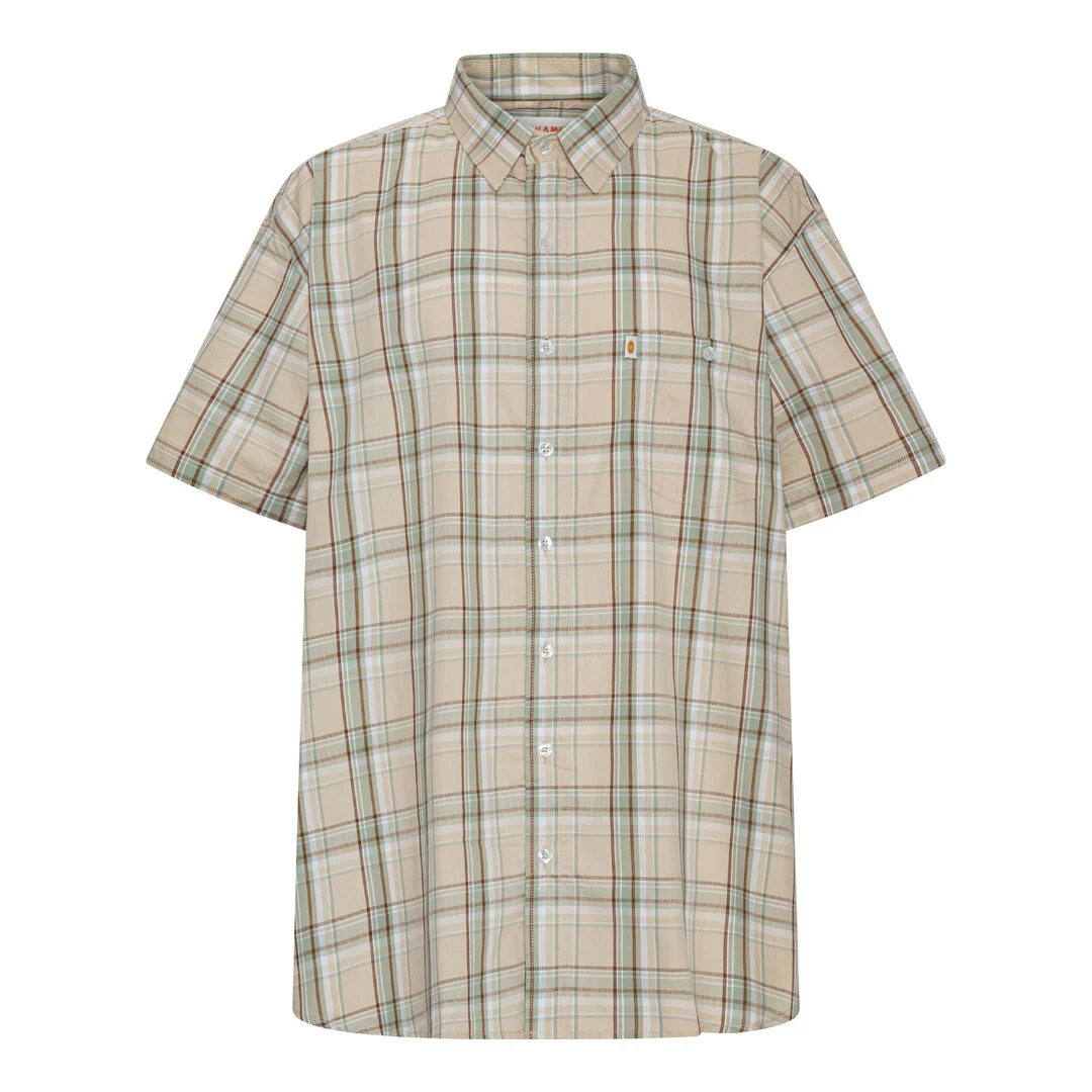 Kortærmet skjorte fra KAMRO i en let og behagelig kvalitet. Det beige ternede mønster kombinerer nuancer af grøn og brun og giver skjorten et klassisk, afslappet udtryk. Designet med brystlomme og almindelig krave er den perfekt til hverdagsbrug – både alene eller åben over en T-shirt for et mere afslappet look.