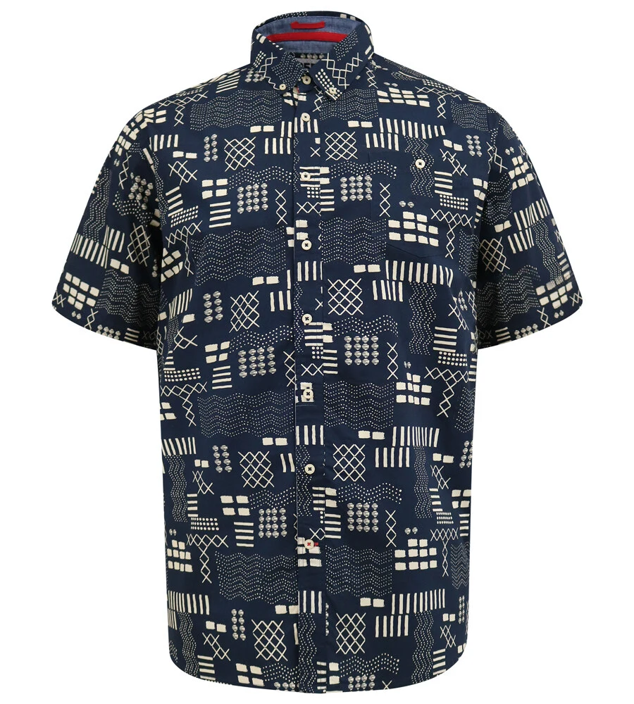 Navyblå skjorte fra D555 med et stilrent grafisk mønster i lyse nuancer, der giver et moderne og karakterfuldt udtryk. Det geometriske print skaber liv i designet, uden at det bliver for prangende.