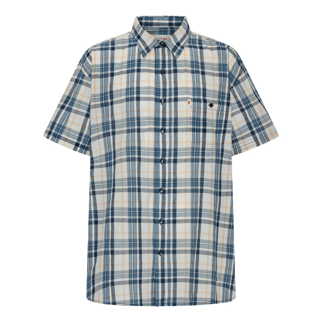 Kortærmet skjorte fra KAMRO med klassiske tern i blå, hvid og sandfarvet nuance. En behagelig og afslappet skjorte med almindelig krave og brystlomme – nem at style til både hverdag og fritid. Det alsidige design passer perfekt til jeans, chinos eller shorts, og farverne giver et frisk, sommerligt udtryk uden at blive prangende.