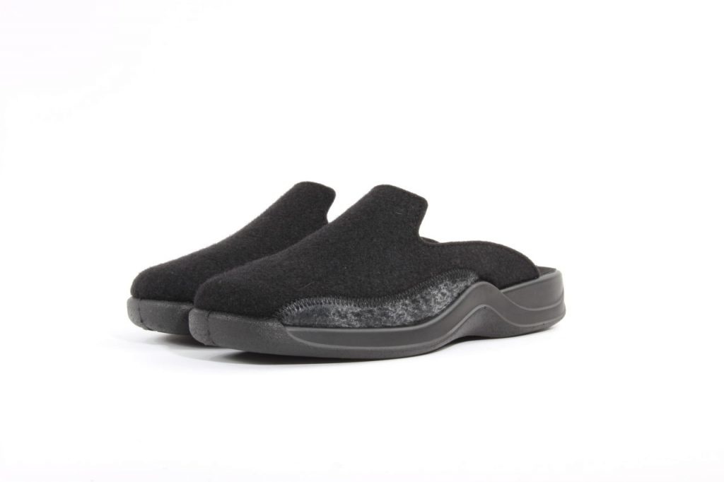 Hjemmeskoene er sorte med en lille detalje i sort kontrast materiale, på ydersiden af foden. Skoen er en tøffelmodel, der er lige til at smutte i.