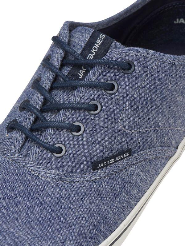 Sneakers i lyseblå kanvas med denim look. Gummisålen har en hvid kant med en sort kontraststribe og selve sålen er blå. Snørrehullerne er i metal.