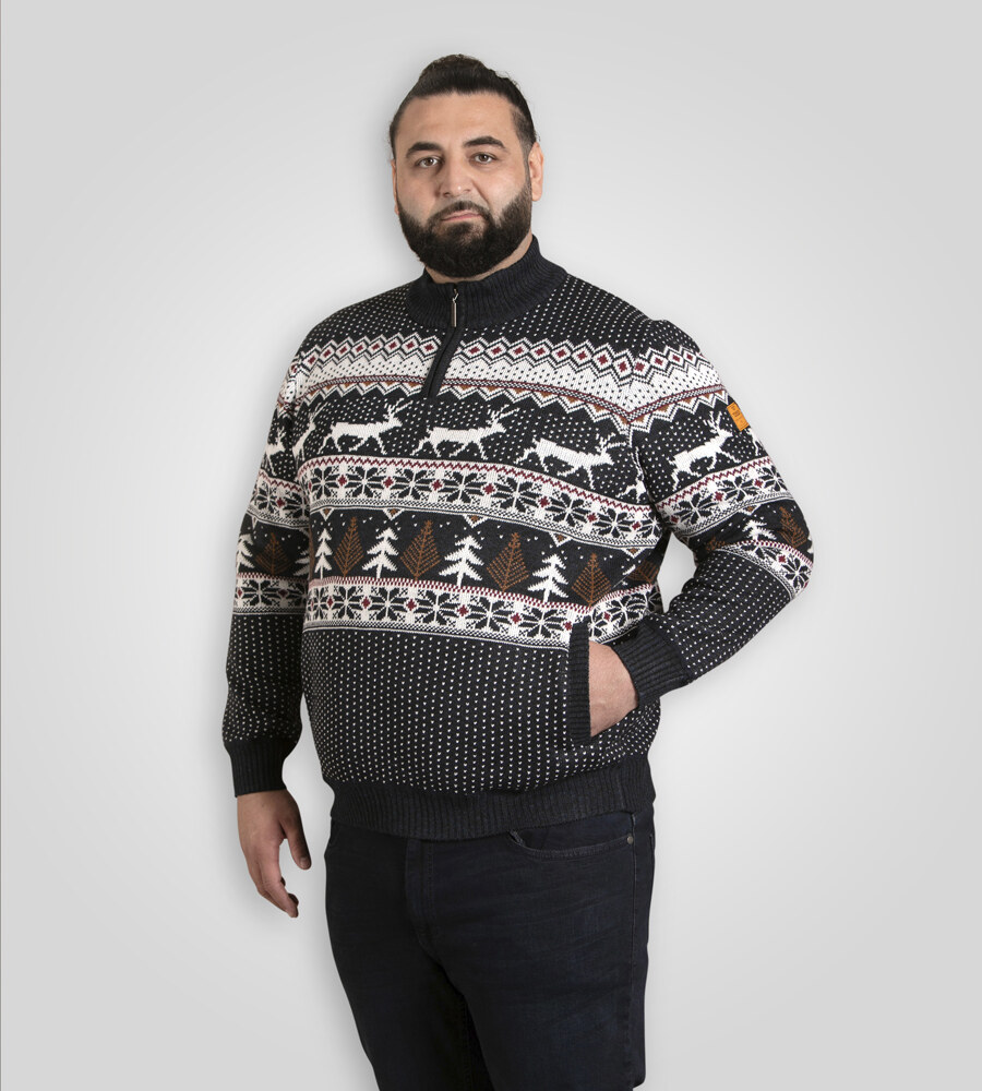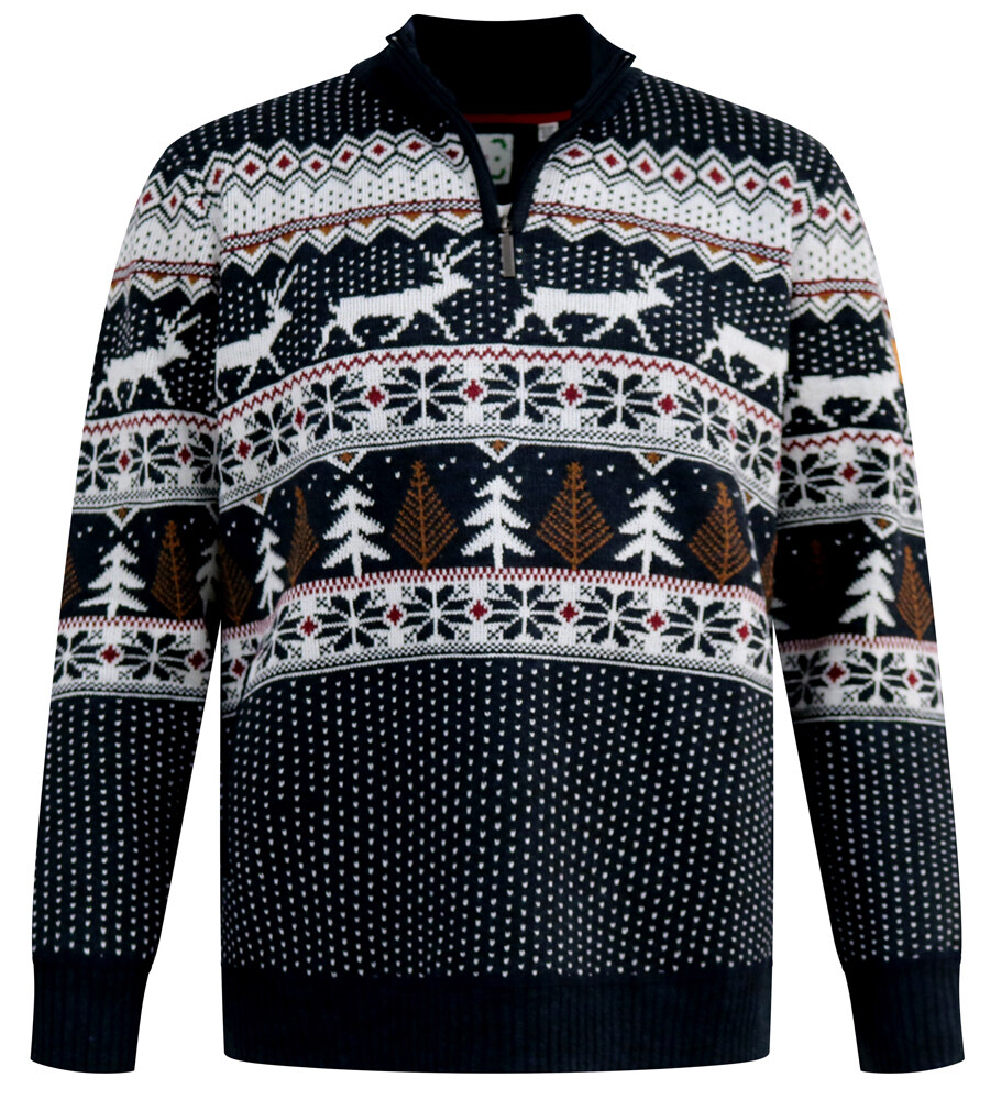 Denne navy striktrøje fra D555 kombinerer klassisk vinterdesign med varme og komfort. Trøjen har et flot jacquardmønster med rensdyr, træer og snefnug i hvide og brune detaljer, som giver et tidløst udtryk.