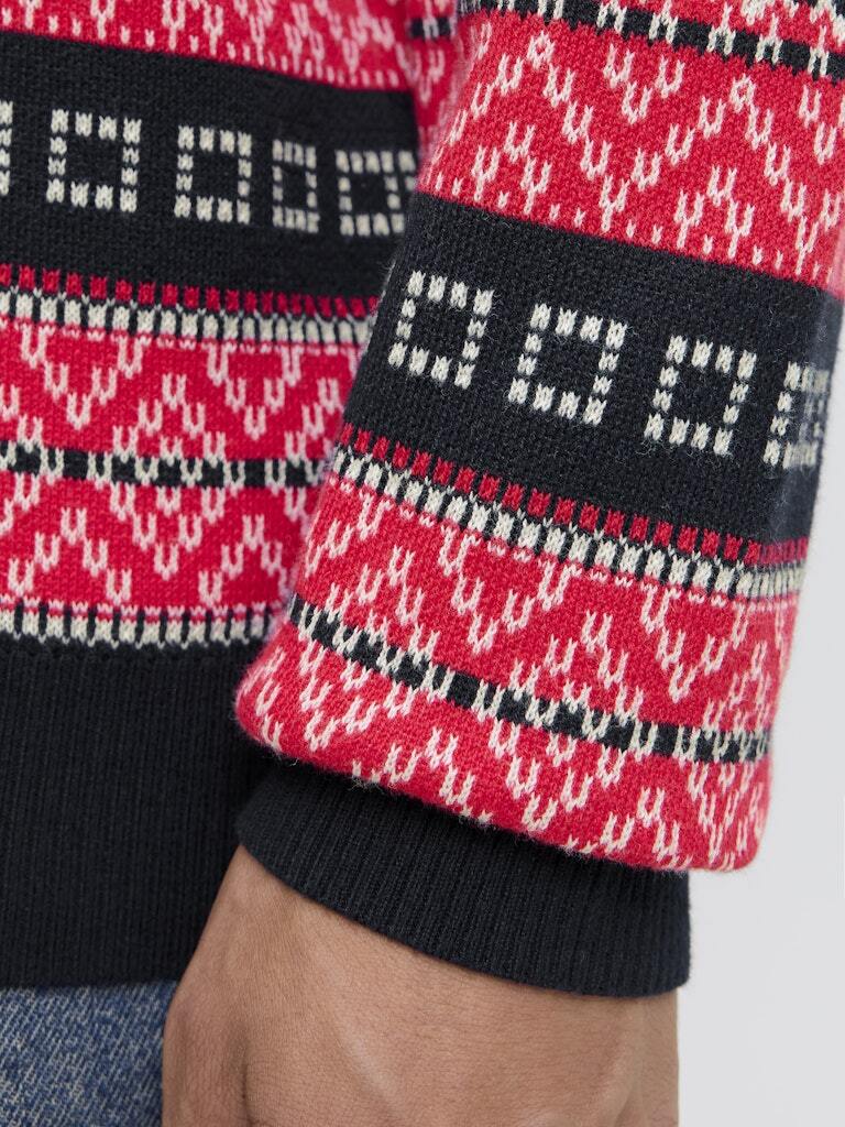 Jack & Jones julesweater i traditionelt mønster med snefnug og røde jacquardstriber – perfekt til decemberhygge. Sweateren har rund hals, ribkant og en behagelig pasform, der gør den oplagt til både julefrokoster og afslappede dage. Den strikkede kvalitet føles blød og varm, uden at være tung – et oplagt valg til den sjove og stilfulde julegarderobe.