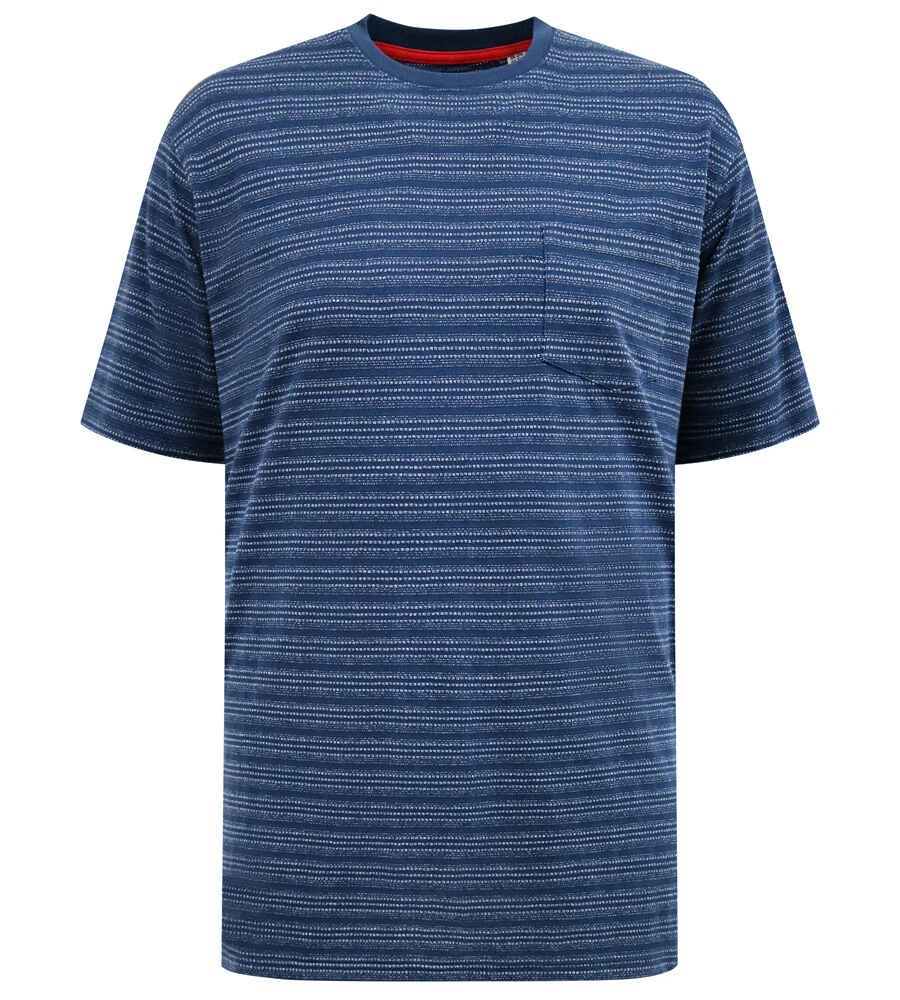 Navy blå T-shirt fra D555 med et diskret stribet mønster, der giver et levende og stilrent udtryk. De fine, vandrette striber skaber spil i stoffet og gør T-shirten mere interessant end en ensfarvet model.