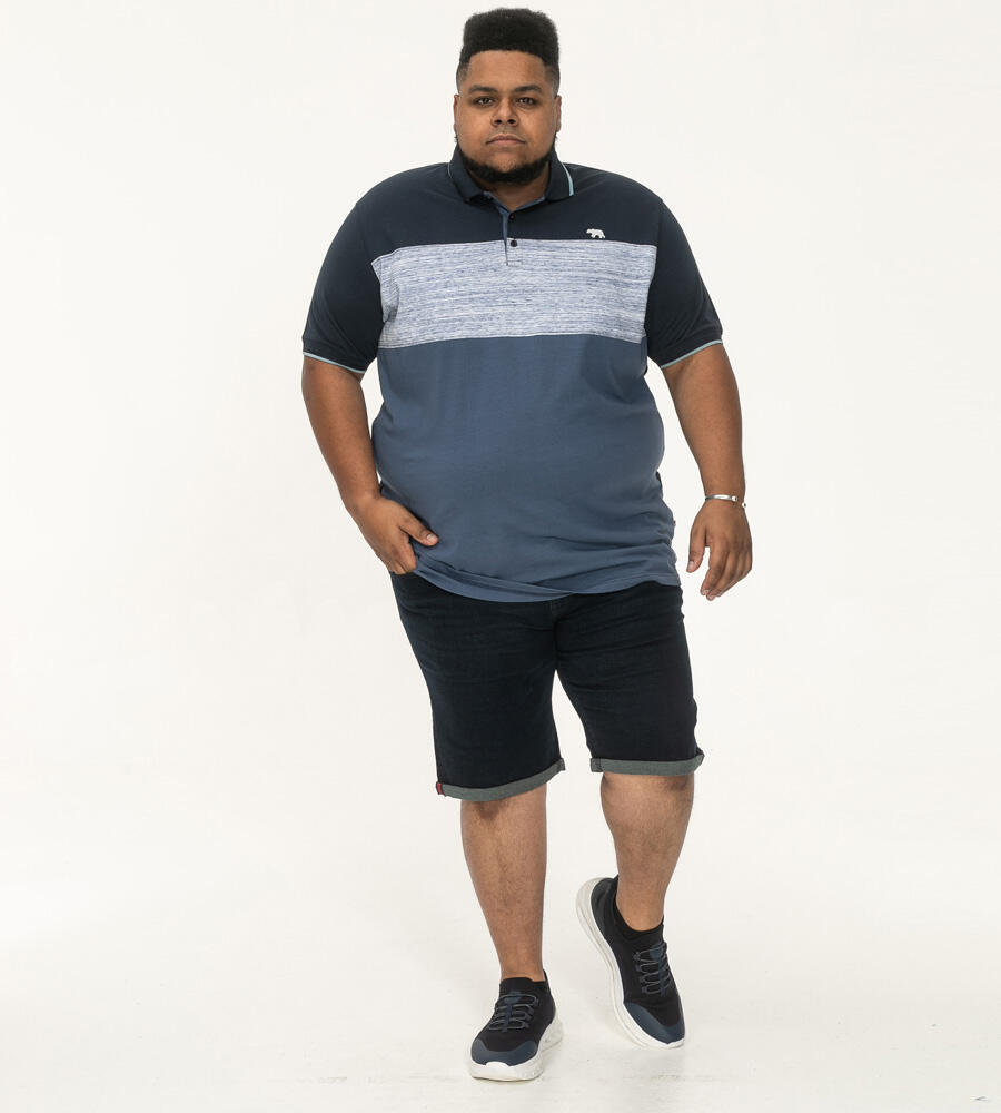 Denne polo kombinerer tre harmoniske farver – navy, meleret lysegrå og støvet blå – i et stilrent farveblok-design. Overgangen mellem de tre nuancer skaber et moderne og balanceret look, som giver poloen karakter uden at virke larmende.