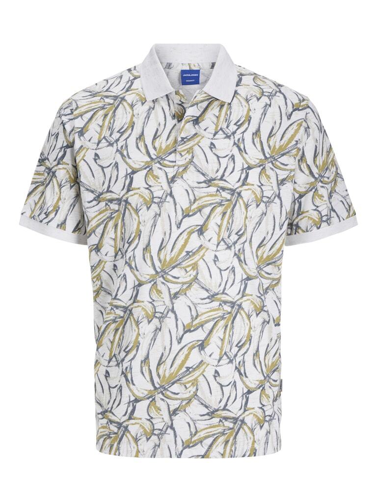 Denne polo er stilfuld og afslappet med et botanisk-inspireret mønster. Mønsteret er en blanding af bløde, gule og grå nuancer på en hvid baggrund, hvilket skaber en let og sommerlig stemning. Poloen har korte ærmer og en klassisk ribbet krave, som giver den et tidløst look. Poloen har en klassisk krave og en lukning med knapper foran. Den er ideel til afslappede dage, hvor komfort og stil går hånd i hånd.