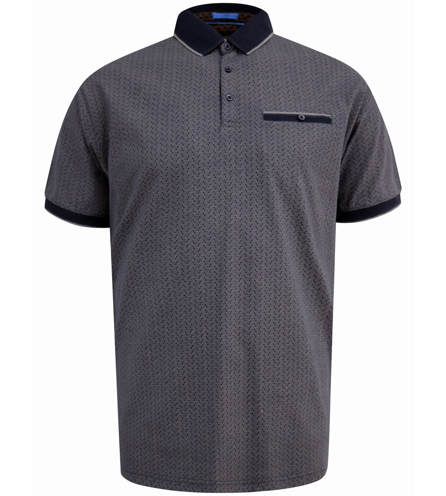 Navy blå polo fra D555 med diskret all-over mønster i kontrastfarve. Modellen har mørk marineblå krave og ærmekanter med en tynd pyntekant, der giver et skarpt og afbalanceret udtryk. Brystlommen har en lille knap og matcher krave og ærmer i farve og stil. Stoffet er blødt og strækbart, hvilket sikrer god komfort og en behagelig pasform til hverdagsbrug.