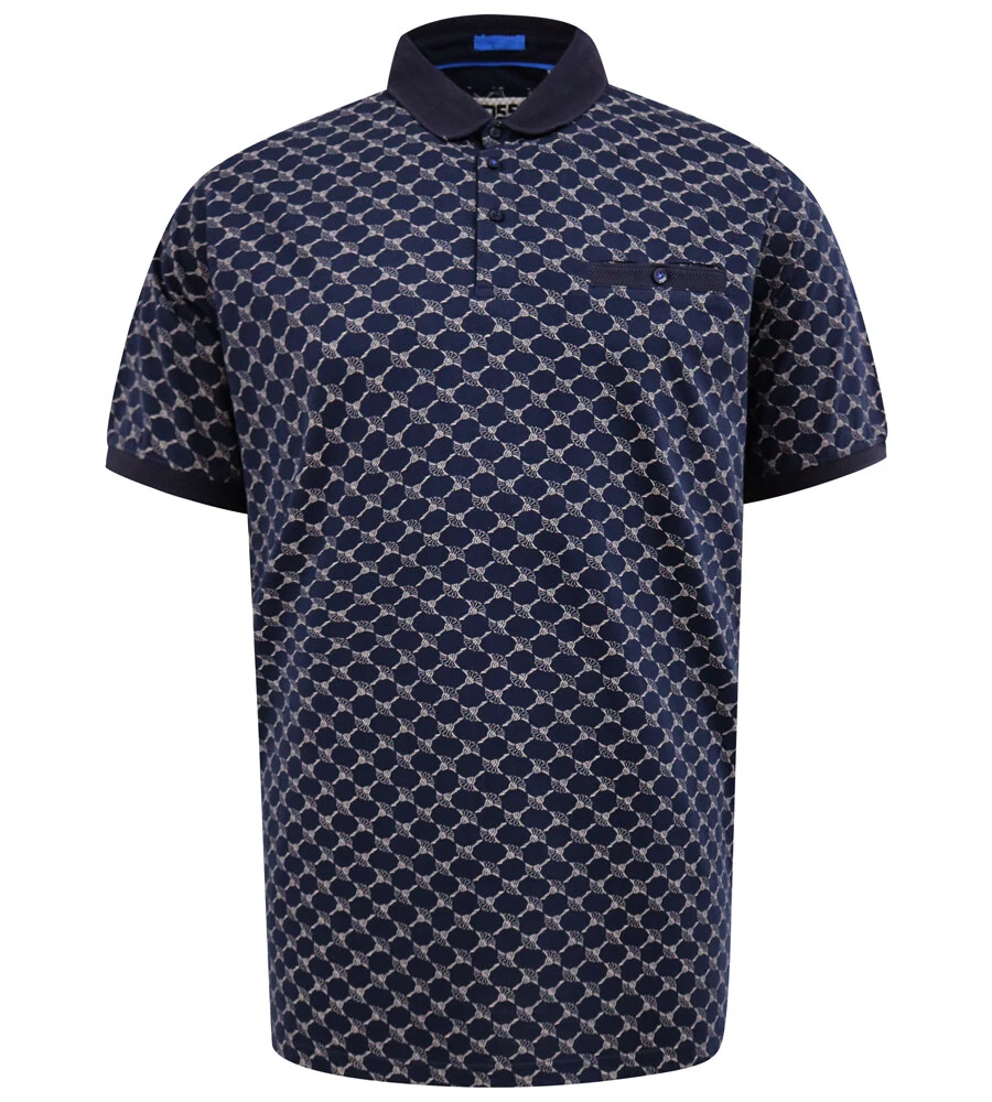 Navyblå polo fra D555 med et gennemgående mønster, der giver et stilrent og lidt mere eksklusivt udtryk. Den klassiske polokrave og knaplukning ved halsen skaber et pænt look, som nemt kan bruges både til hverdag og lidt mere velklædte anledninger.