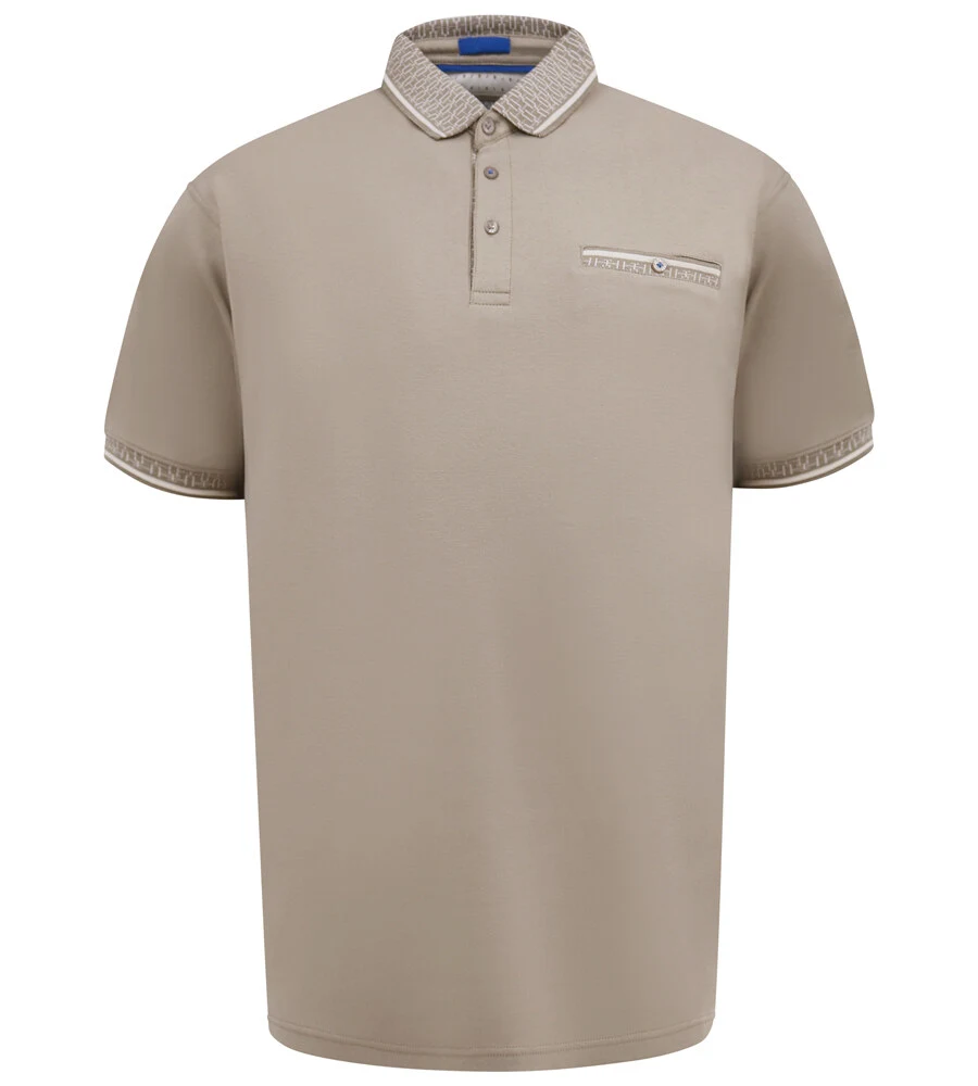 Sandfarvet polo fra D555 i et enkelt og stilrent design med fine kontrastdetaljer ved krave, ærmer og brystlomme. Den klassiske polokrave og knaplukning giver et pænt og velklædt udtryk, som gør den nem at bruge til både hverdag og mere afslappede, pæne anledninger.