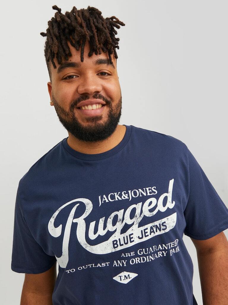 På T-shirten står der blandt andet "Rugged - Blue Jeans", "Jack & Jones".