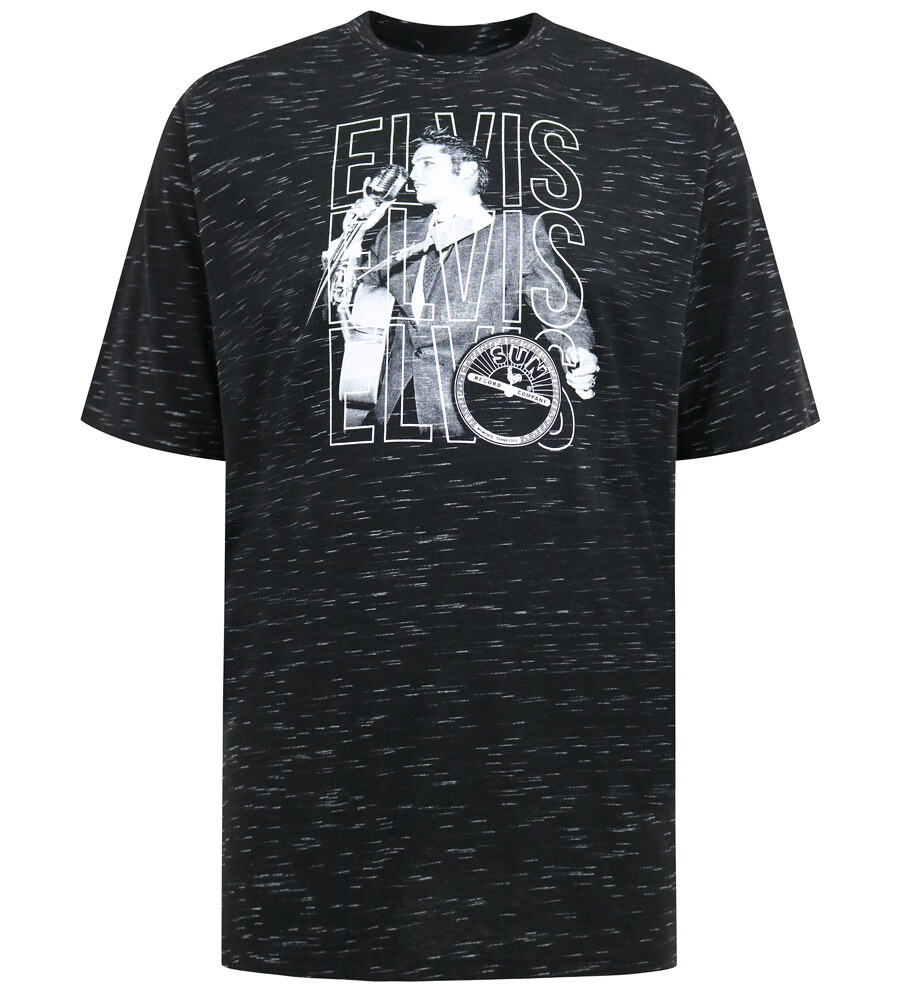 Sort T-shirt fra D555 med hvid meleret effekt og frontprint af Elvis Presley. Motivet viser Elvis med mikrofon og guitar, kombineret med teksten “ELVIS” i lag og det ikoniske Sun Records-logo. T-shirten har rund hals og en klassisk, afslappet pasform. Fremstillet i en blød bomuldsblanding, velegnet til hverdagsbrug og til dig, der værdsætter musikalsk nostalgi.